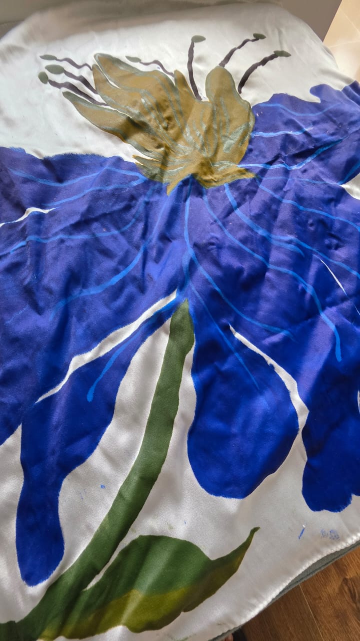 These gorgeous hand-painted satin scarves (18x18 inches of pure flowy goodness) are made right here, each one lovingly brushed, not printed.