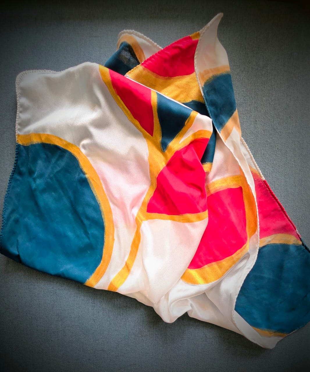 These gorgeous hand-painted satin scarves (18x18 inches of pure flowy goodness) are made right here, each one lovingly brushed, not printed.